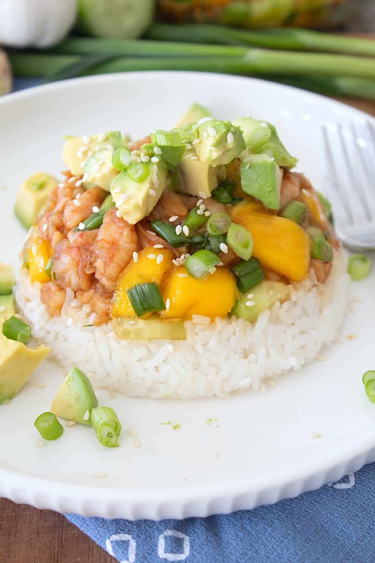 - Mix the fully cooked shrimp, avocado, cucumber, sliced mango, and green onions together in a bowl.