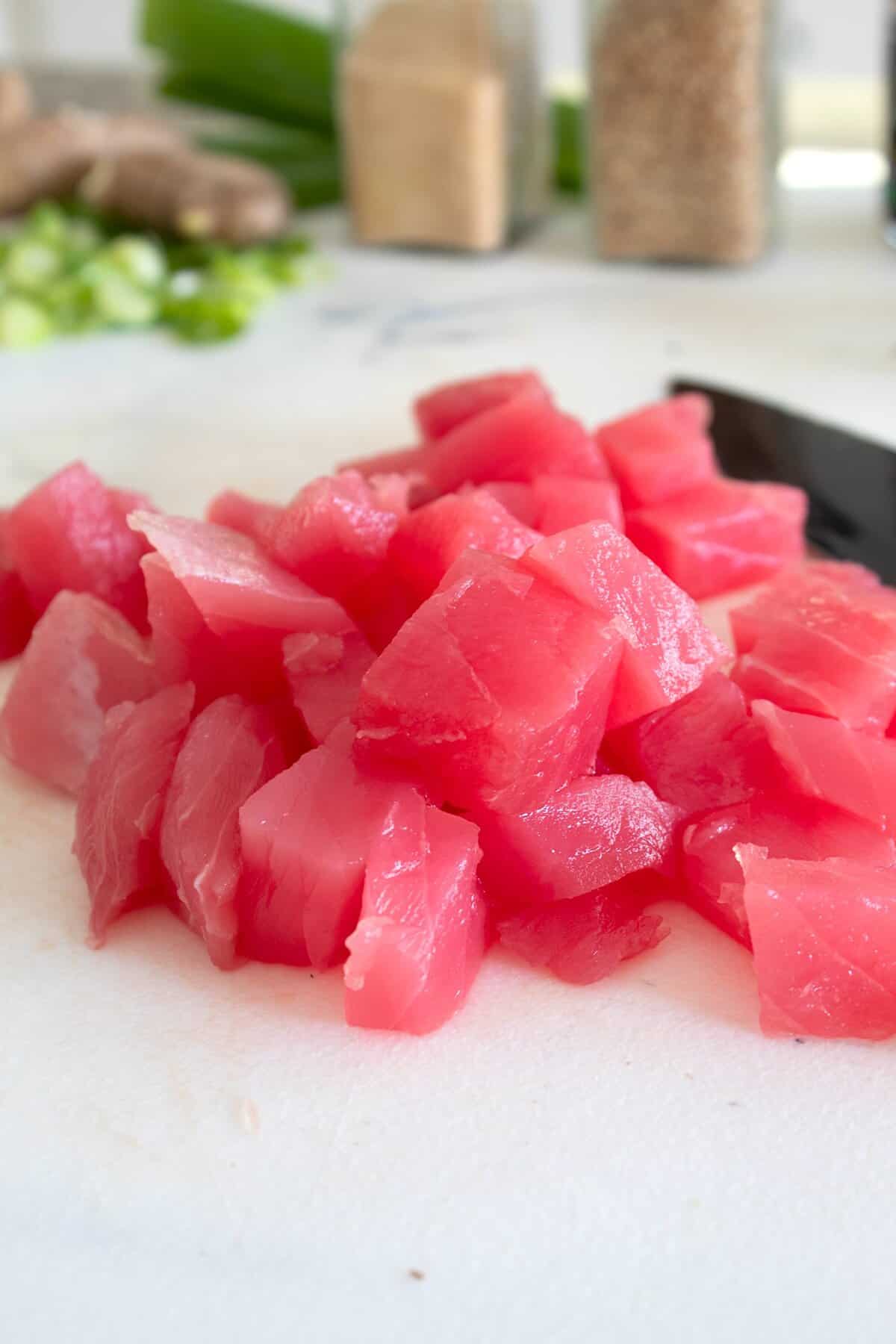 - 1.5 lb ahi tuna steak (cut into 3/4 inch cubes)