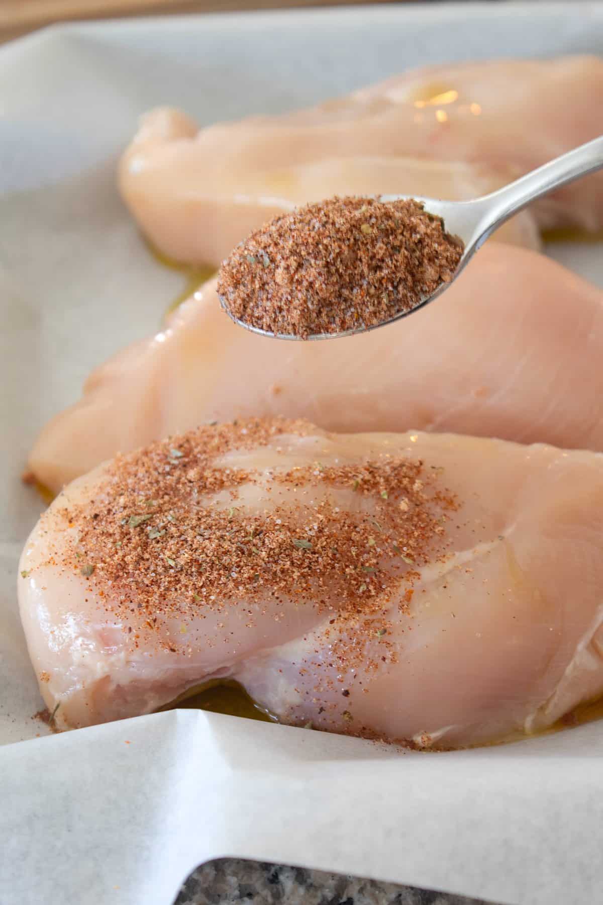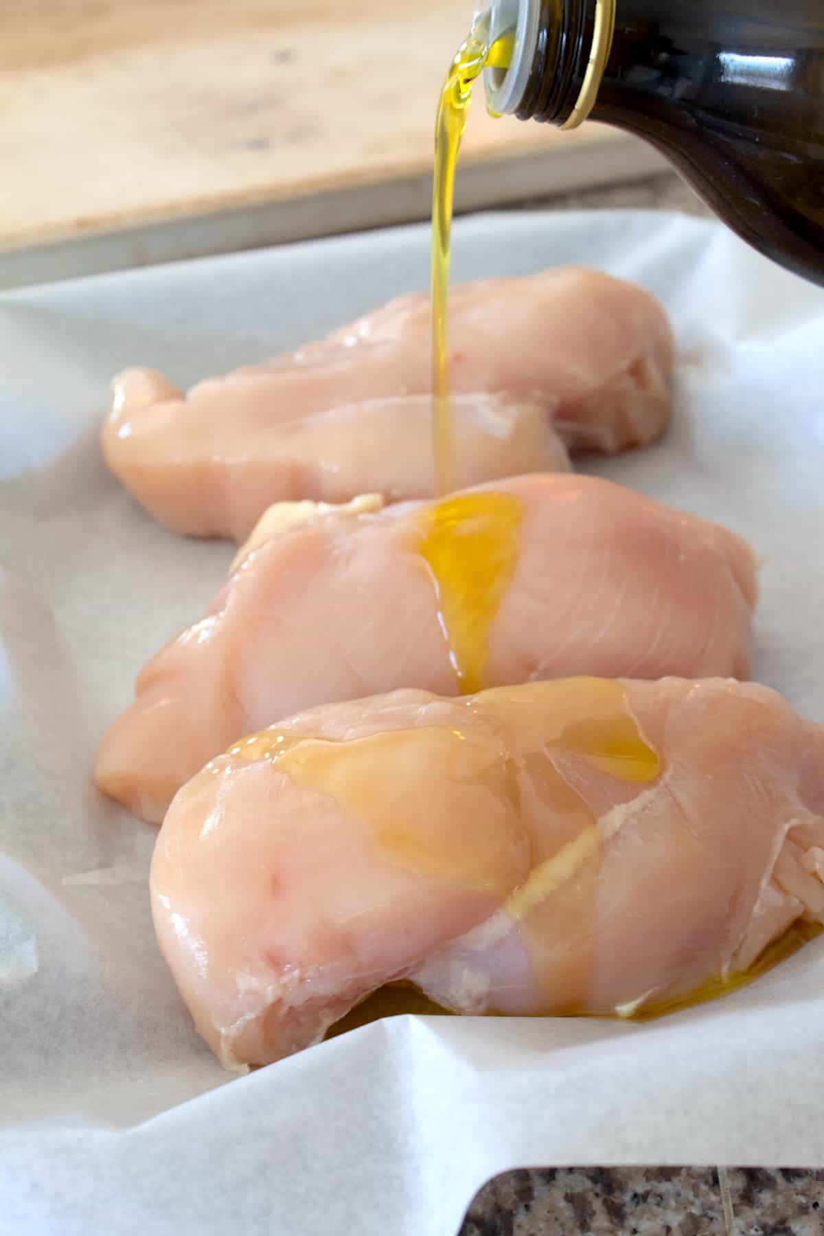 - Place chicken breasts on parchment paper lined sheet pan. Drizzle olive oil over chicken breasts, and massage into chicken.