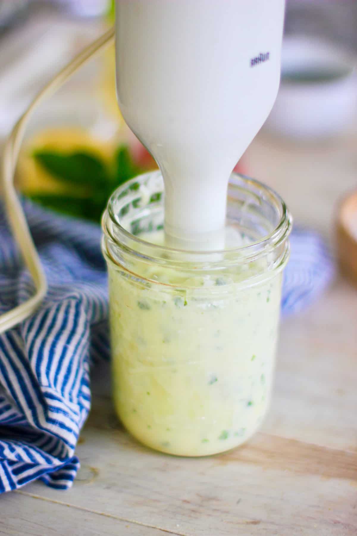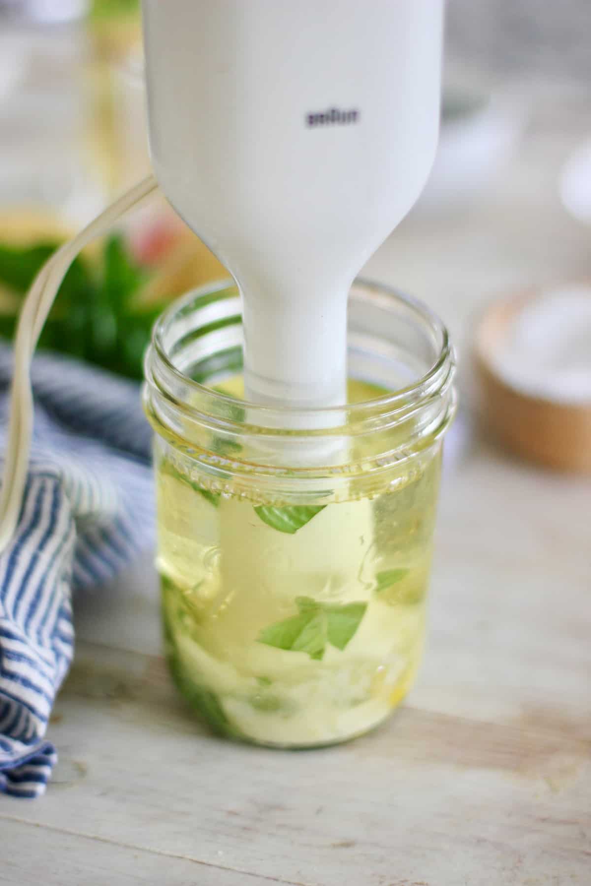 Using a wide mouth canning jar or cylinder type container add the egg, lemon juice, dijon, salt, oil and top with fresh basil. Basically all ingredients in the jar! Just be sure to add the egg first.