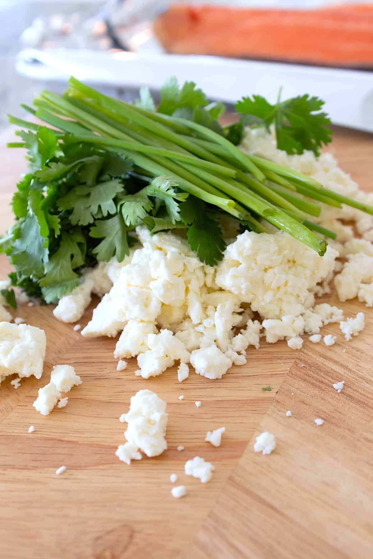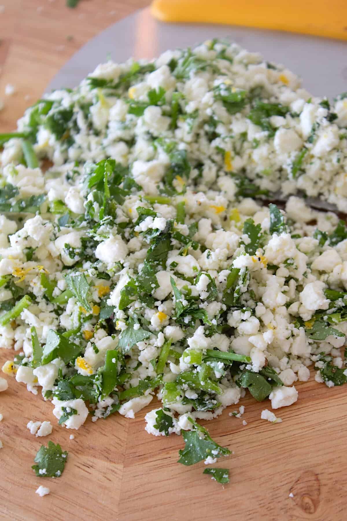 - Combine parsley, chives, feta, lemon, salt and pepper on cutting board. Rough chop several times, chopping up all ingredients to mix.