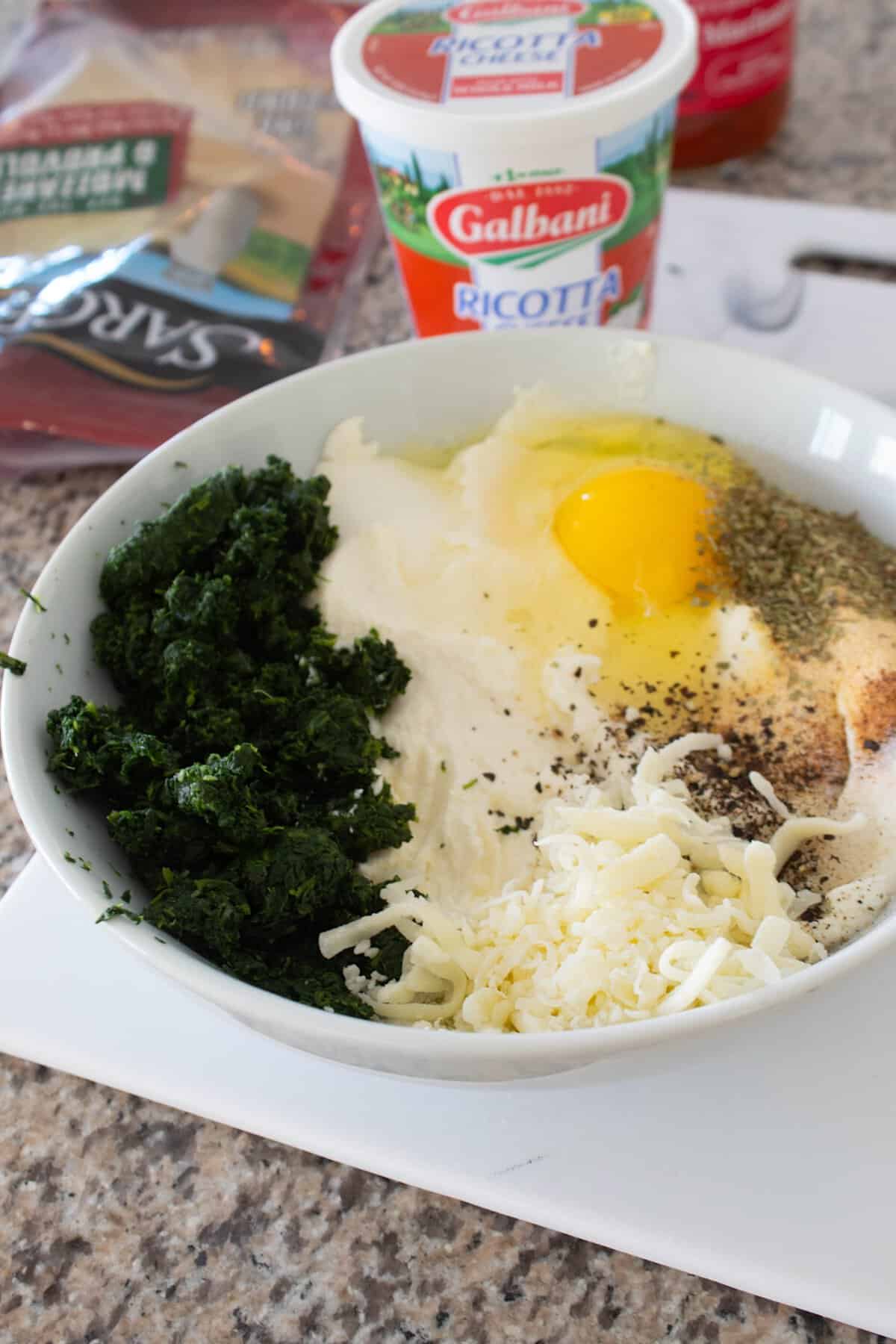 • Mix ricotta, egg, shredded mozzarella, garlic, Italian seasoning, salt, pepper & steamed spinach (make sure the spinach is cooled so it doesn’t melt the ricotta/scramble the egg) together in a bowl. Mix with a fork until fully combined.