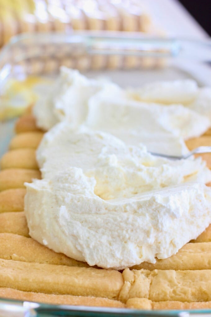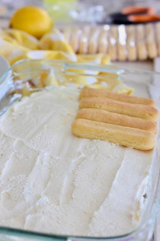 - Once you have covered the bottom of your pan with soaked cookies, smooth half the cream and mascarpone mixture over the cookies. Repeat with cookies and end with the cheese mixture. Sprinkle with remaining lemon zest.