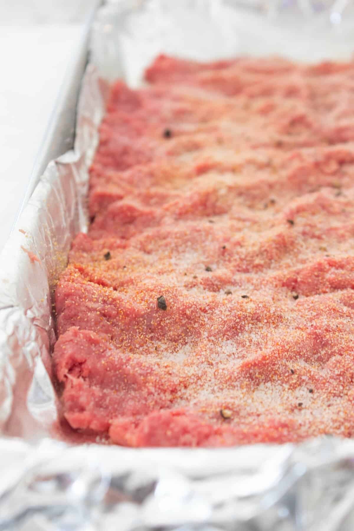 Spread the ground meat on the foil lined sheet pan, season it, and then bake it at 375 degrees until it’s fully cooked. Per the FDA, ground meat is cooked once it reaches 160 degrees.