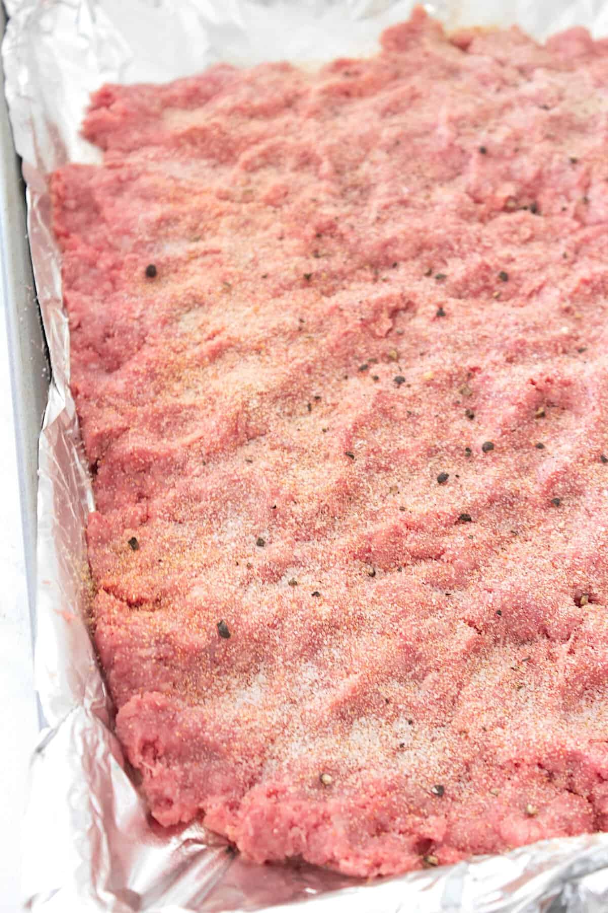 - Spread the ground beef directly onto the foil lined sheet pan, and spread it out to the edges of the pan. Note that the meat will shrink once it bakes.