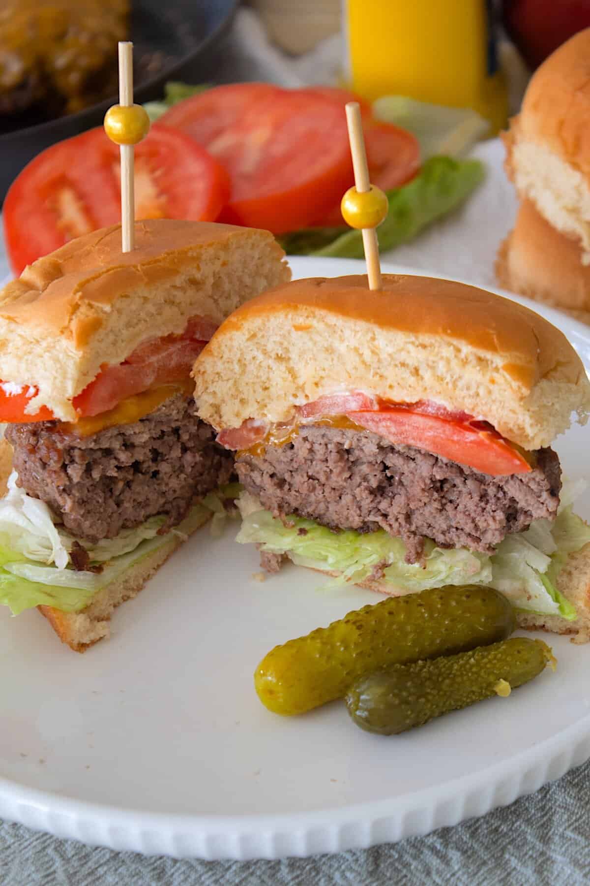 Stovetop Burgers are the perfect way to enjoy a perfect cheeseburger year round, with no grill.  A delicious seasoned meat is formed into patties, and cooked to perfection on the stove, topped with melty cheese for one of the best burgers you’ll ever have.